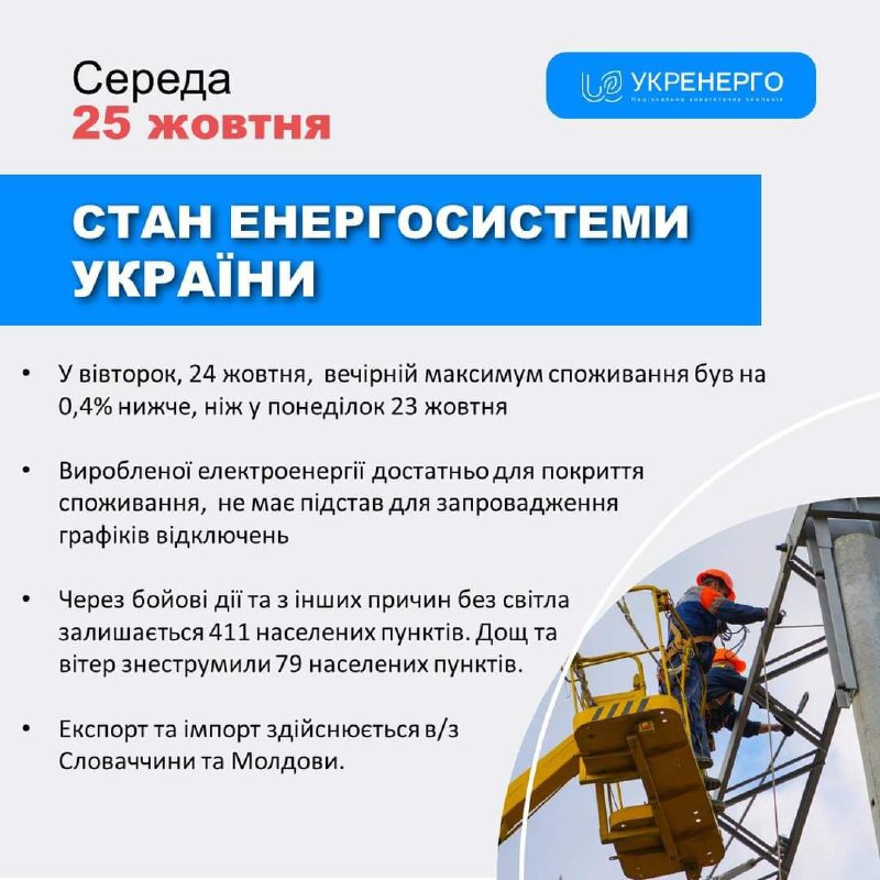 🔹Через бойові дії та з інших причин без світла залишається 411 населених пунктів. Дощ та вітер знеструмили 79 населених пунктів.