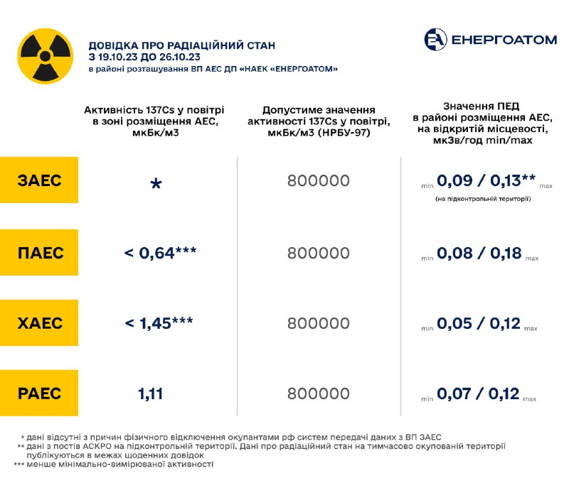 ☢️ Довідка про радіаційний стан у період з 19 по 26 жовтня 2023 року в районі розташування ВП АЕС ДП «НАЕК «Енергоатом» 27.10.2023, П’ятниця | 14:49 Автор допису: Енергоатом ☢️ Довідка про радіаційний стан у період з 19 по 26 жовтня 2023 року в районі розташування ВП АЕС ДП «НАЕК «Енергоатом» THEA Джерело Друк / PDF