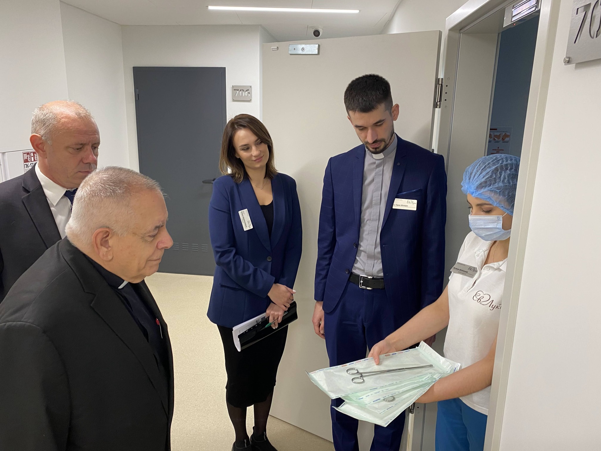 Отець Тарас Вілюра, адміністратор та капелан медичного закладу, та пані Тетяна, менеджерка клініки, ознайомили гостей з роботою клініки, зокрема соціальними проєктами, які вона реалізовує у допомозі малозабезпеченим категоріям осіб та внутрішньо переміщеним особам.