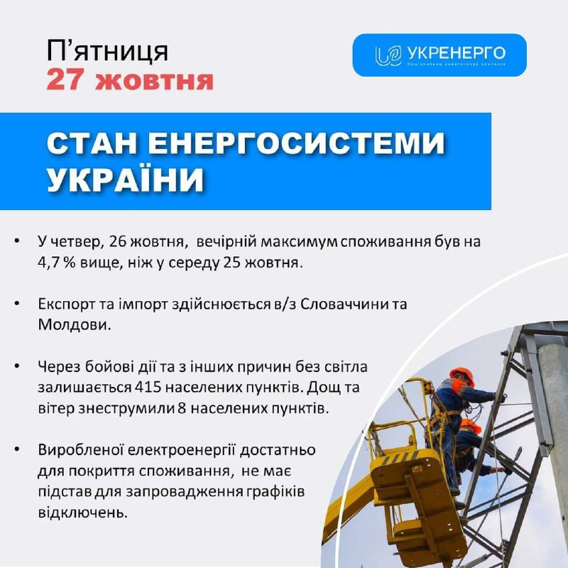 🔹У четвер, 26 жовтня, вечірній максимум споживання був на 4,7 % вище, ніж у середу, 25 жовтня.