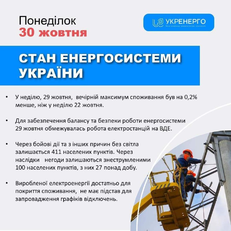 СТАН ЕНЕРГОСИСТЕМИ УКРАЇНИ: 🔹У неділю, 29 жовтня, вечірній максимум споживання був на 0,2% менше, ніж у неділю, 22 жовтня.