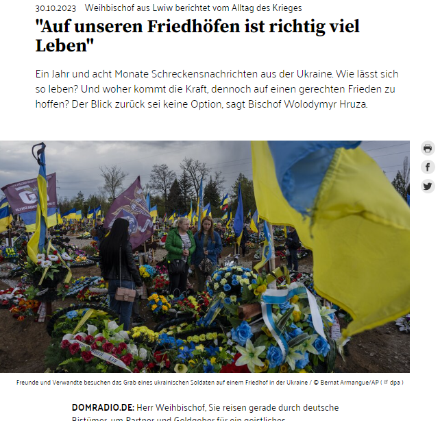 Про це сказав єпископ-помічник Львівської архиєпархії владика Володимир у розмові з Беатріче Томасетті для німецької католицької радіостанції DOMRADIO.DE. під час офіційного візиту німецькими єпархіями з метою пошуку партнерів і жертводавців для будівництва духовного-реабілітаційного центру для людей постраждалих від наслідків війни, який розпочався 23 жовтня 2023 року.