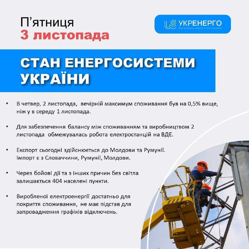 СТАН ЕНЕРГОСИСТЕМИ УКРАЇНИ: 🔹В четвер, 2 листопада, вечірній максимум споживання був на 0,5% вище, ніж у в середу 1 листопада.