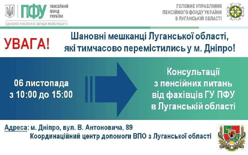 Якщо ви перебуваєте у м. Дніпро і потребуєте консультації спеціаліста Головного управління Пенсійного фонду України в Луганській області, звертайтесь на наступний прийом, який відбудеться 6 листопада з 10:00 до 15:00.