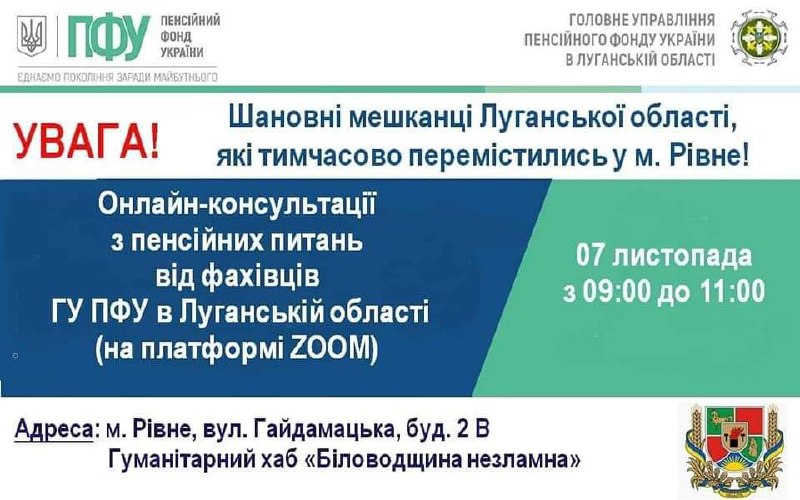 Із 09:00 до 11:00 у віторок, 7 листопада, у гуманітарному хабі Біловодської громади у м. Рівне відбудеться онлайн-консультування з пенсійних питань від фахівця ГУ ПФУ в Луганській області.