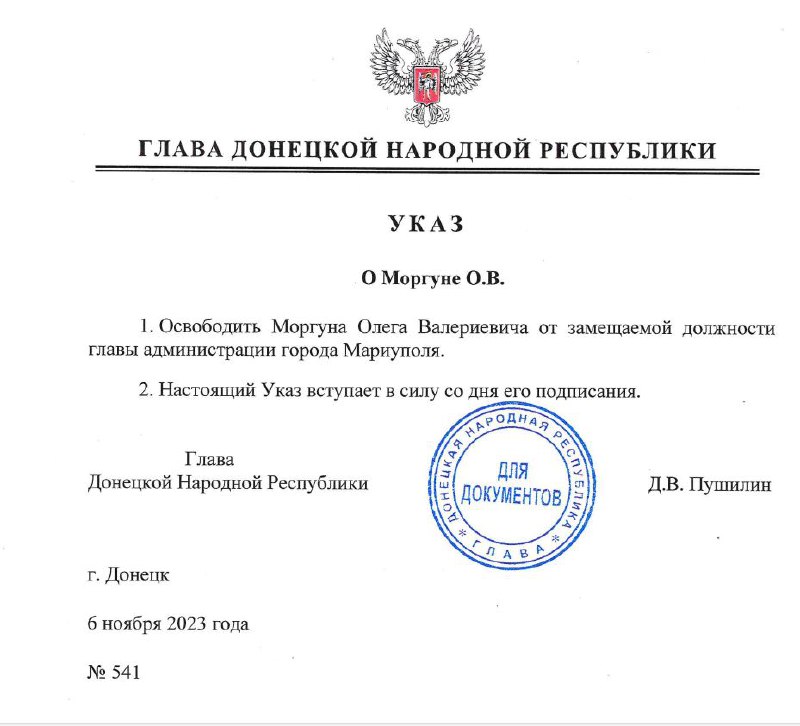 🤷‍♂️Вік зрадників – недовгий. Псевдомера тимчасово окупованого Маріуполя олега моргуна звільнено указом глави так званого днр.