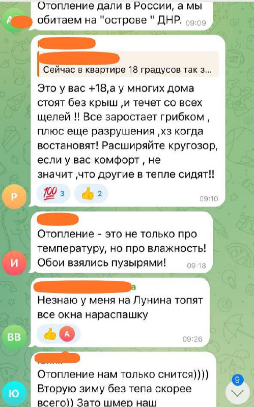 "У будинку холодніше, ніж на вулиці", "У багатьох будинки стоять без покрівлі і тече з усіх щілин. Все заростає грибком плюс ще руйнування. Невідомо, коли відновлять", "Площа Лівого берега опалення, як не було, так й не буде. Кажуть, не скоро дадуть. Другий рік без опалення".