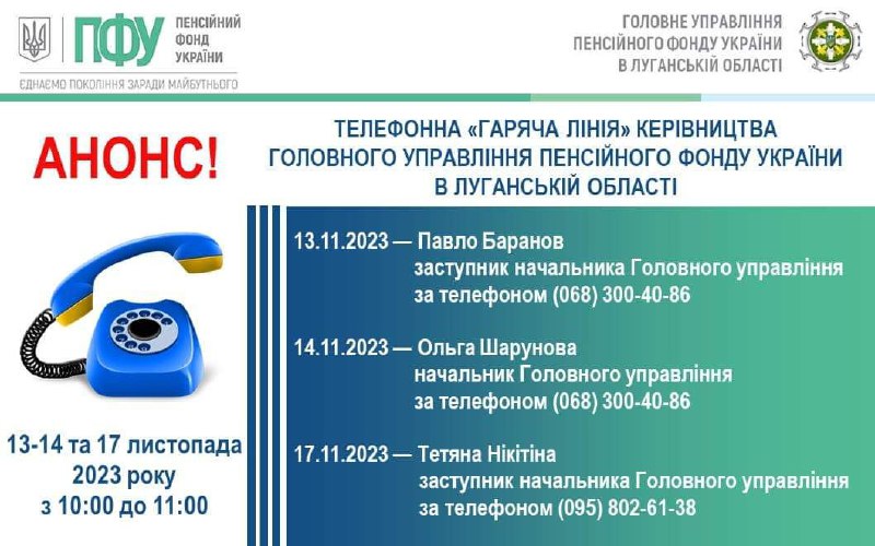У понеділок, 13 листопада, із 10:00 до 11:00 свої запитання мешканці регіону зможуть поставити заступнику начальника Головного управління Пенсійного фонду України у Луганській області Павлу Баранову. Телефон: (068) 300-40-86.
