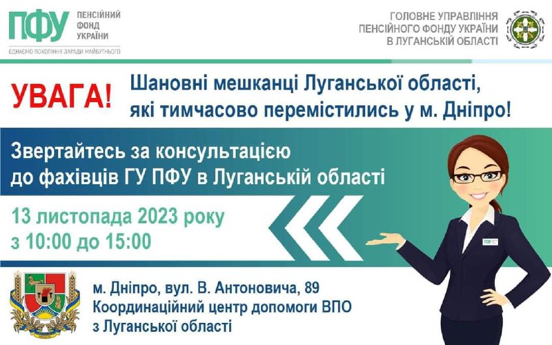 Щопонеділка спеціаліст Головного управління Пенсійного фонду України в Луганській області проводить прийом внутрішньо переміщених осіб, які тимчасово мешкають у м. Дніпро.