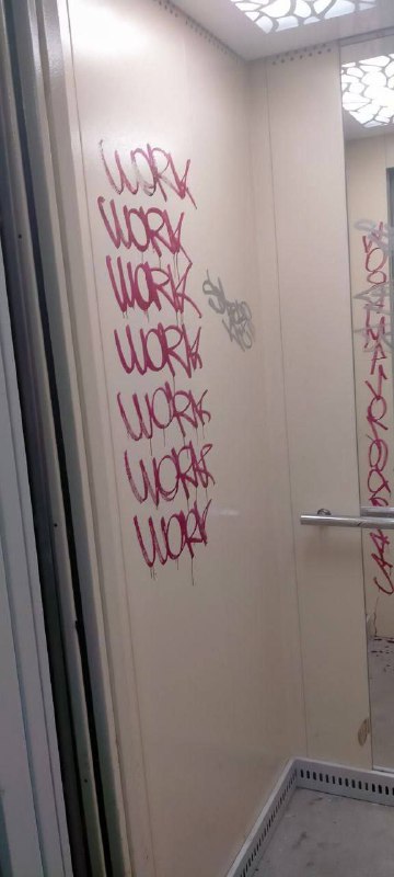 😉Але й встановлені ліфти довго не пробули в первинному вигляді. Їх одразу розмалювали англійськими літерами.