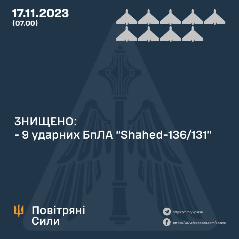 Доброго ранку всій Україні! Цієї ночі ворог атакував наші мирні міста і села десятьма ударними БпЛА 17.11.2023, П’ятниця | 8:54 Автор допису: Голова Кіровоградської обласної військової адміністрації Доброго ранку всій Україні! Цієї ночі ворог атакував наші мирні міста і села десятьма ударними БпЛА. Дев’ять знищили охоронці неба. На Кіровоградщині – без надзвичайних подій. Дякуємо нашим славним Збройним Силам України за те, що ми живі!Разом ми сильні! Україна переможе! 🇺🇦💪 Джерело Друк / PDF