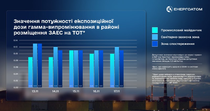 З 13-го по 17 листопада 2023 року потужність експозиційної дози гамма-випромінювання в районі розміщення Запорізької АЕС на тимчасово окупованих територіях України відповідала чинним нормам.