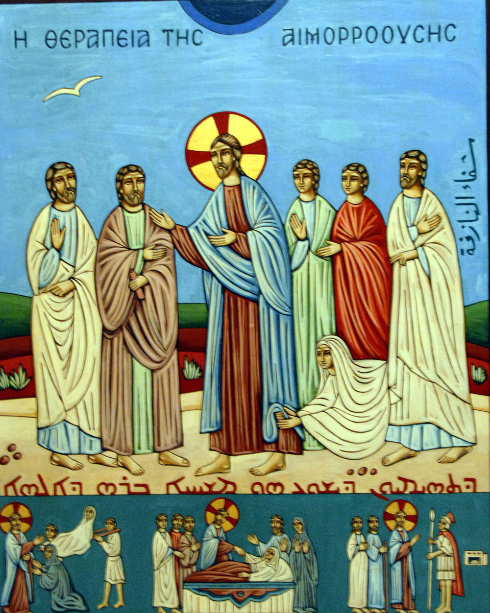 Євангелист Лука поміщає розповідь про оздоровлення кровоточивої жінки всередині розповіді про воскресіння дочки Яіра. Ісус Христос іде до дому Яіра, старшого синагоги, серед натовпу людей, коли до нього наближається безнадійно хвора жінка. Дочка Яіра померла, вона втрачена для життя. Кровоточива жінка також в певному сенсі втрачена для життя. Вона живе в ізоляції, бо як ритуально нечиста не може спілкуватись з іншими людьми. Це — її суспільна смерть. Вона на власному досвіді переконалася, що безнадійно хвора. Адже зверталась до лікарів, але безуспішно: її стан тільки погіршувався. Хворіла вона 12 років — біблійне число повноти. Таким чином, з тих небагатьох слів, якими євангелист Лука описує жінку, ми дізнаємось, що це була жінка, безнадійно втрачена для життя з людьми.