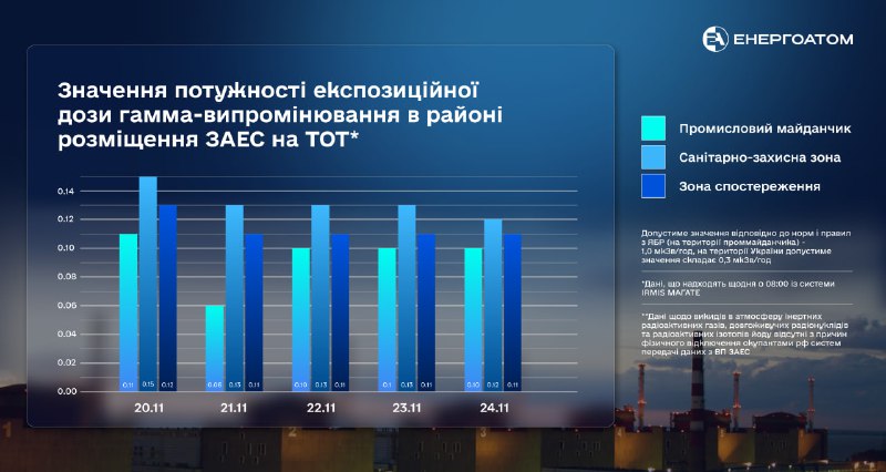 З 20-го по 24 листопада 2023 року потужність експозиційної дози гамма-випромінювання в районі розміщення Запорізької АЕС на тимчасово окупованих територіях України відповідала чинним нормам.