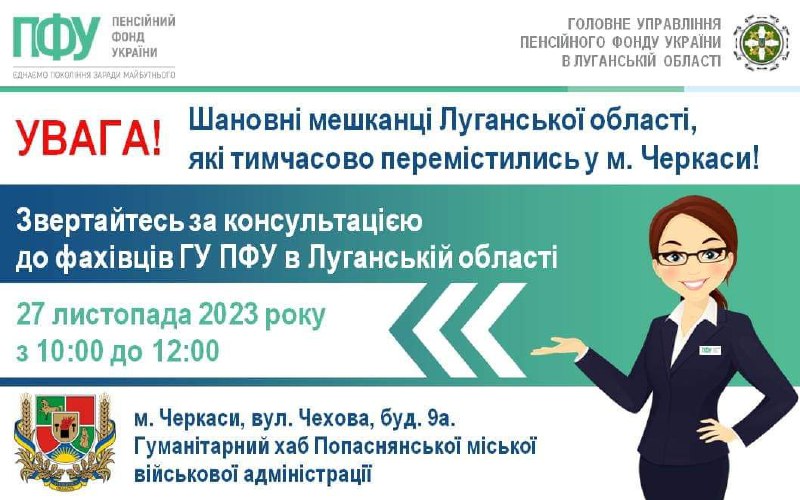 У Черкасах у понеділок луганських ВПО консультуватимуть пенсійники Прийом відбудеться 27 листопада у місцевому хабі Попаснянської громади. 25.11.2023, Субота | 13:32 Автор допису: Голова Луганської обласної військової адміністрації У Черкасах у понеділок луганських ВПО консультуватимуть пенсійники Прийом відбудеться 27 листопада у місцевому хабі Попаснянської громади. Адреса: м. Черкаси, вул. Чехова, буд. 9а. Співробітник ГУ ПФУ в Луганській області спілкуватиметься з ВПО там із 10:00 до 12:00. Джерело Друк / PDF