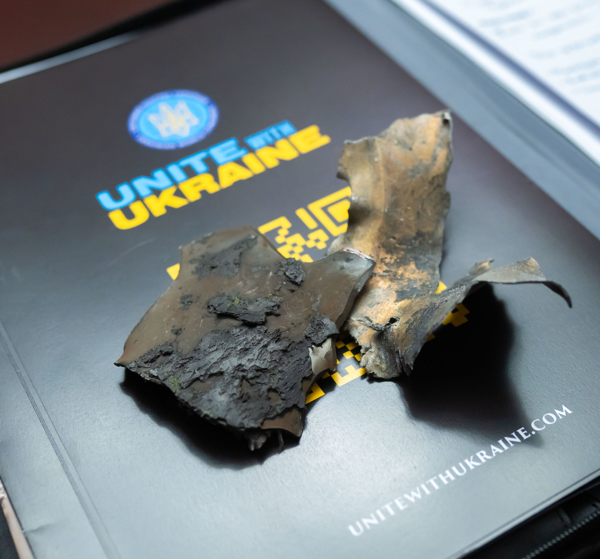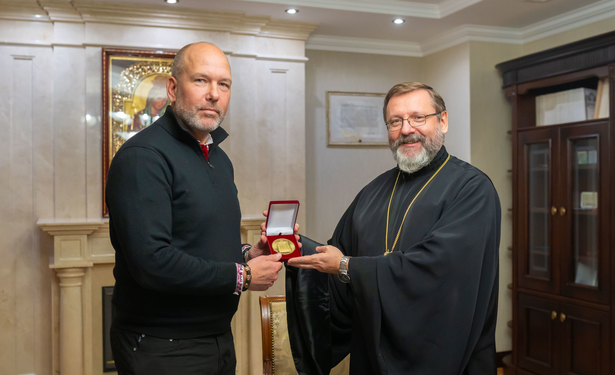 Тоді учасники обмінялися символічними подарунками. Пан Павло подарував Главі УГКЦ підсвічник, виготовлений із латунних гільз калібру 152 мм зі скляною інкрустацією з розбитого вікна в Лимані Донецької області. Всередині скла — уламок російської ракети С-300, яка зруйнувала будівлю. Блаженніший Святослав подарував уламок російського безпілотника, збитого біля Патріаршого собору Воскресіння Христового в Києві, а також медаль, яку було видано в рамках святкування 1125-ліття древнього Галича.