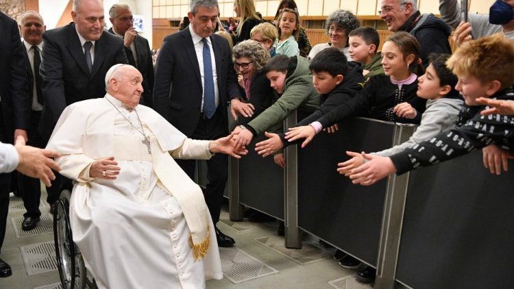 На початку Папа Франциск розповів про цьогорічний вертеп на площі святого Петра, який має на меті відтворити через вісімсот років різдвяну атмосферу 1223 року, коли святий Франциск Ассізький забажав організувати перший різдвяний вертеп на землях сучасної Італії. «Його подорож до Святої Землі все ще була живою в його пам’яті, а печери Ґреччо нагадували йому краєвид Вифлеєму. Тому він попросив презентувати різдвяну сцену в цьому маленькому селі: з різних куточків прибуло багато ченців, завітали також чоловіки й жінки з навколишніх осель, створюючи живий вертеп. Так народилася традиція вертепу в нашому розумінні», – пригадав Святіший Отець. За його словами, споглядаючи Ісуса, Який народився у Святій Землі, думка лине до її мешканців, які страждають від війни, висловлюючи їм нашу духовну близькість та підтримку.