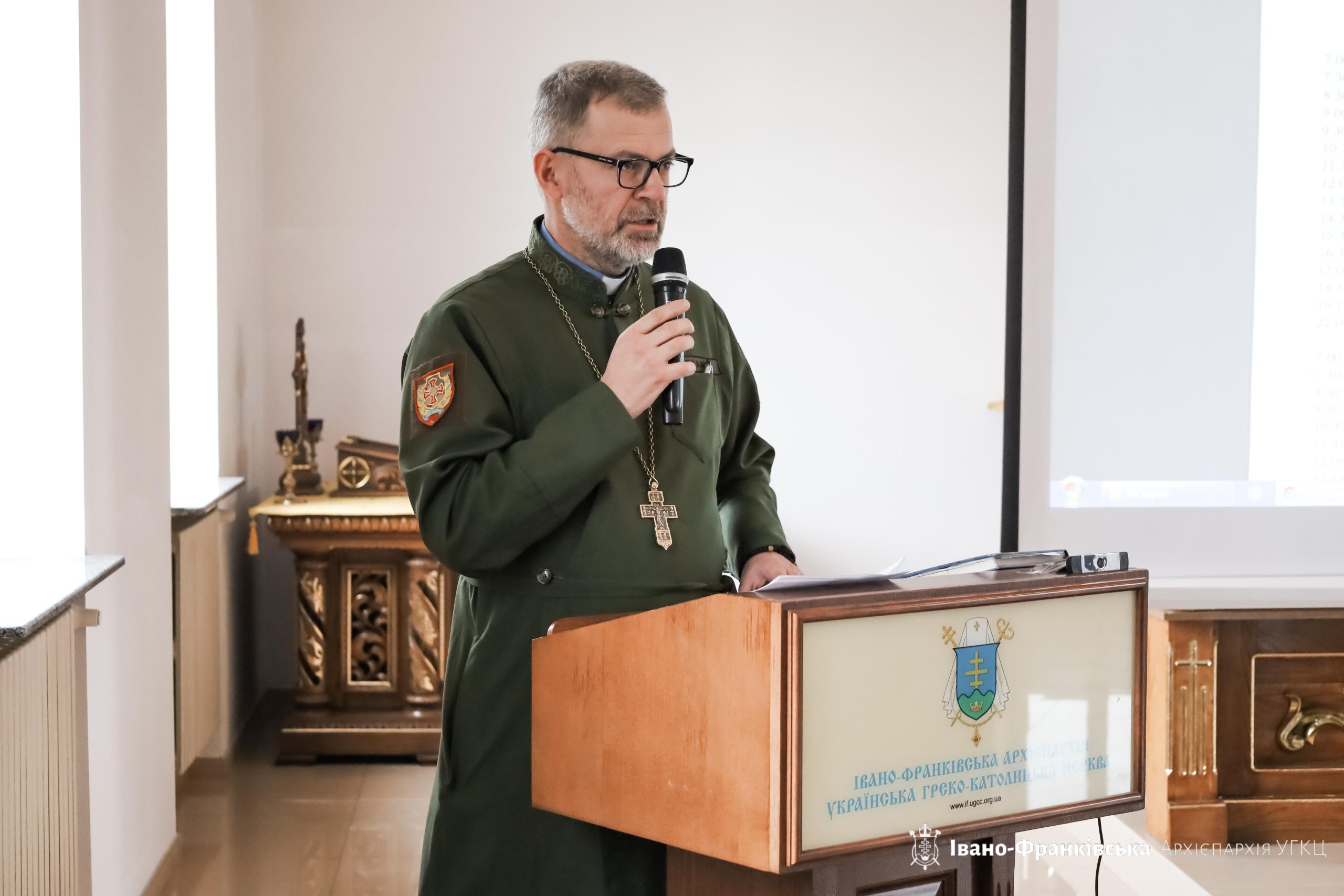 Пізніше слово мав прот. Василь Пасічник-Рак, синкел у справах капеланського служіння Архієпархії, який повідомив про служіння штатних військових капеланів та тих душпастирів, які на волонтерських засадах відвідують військових на фронті.