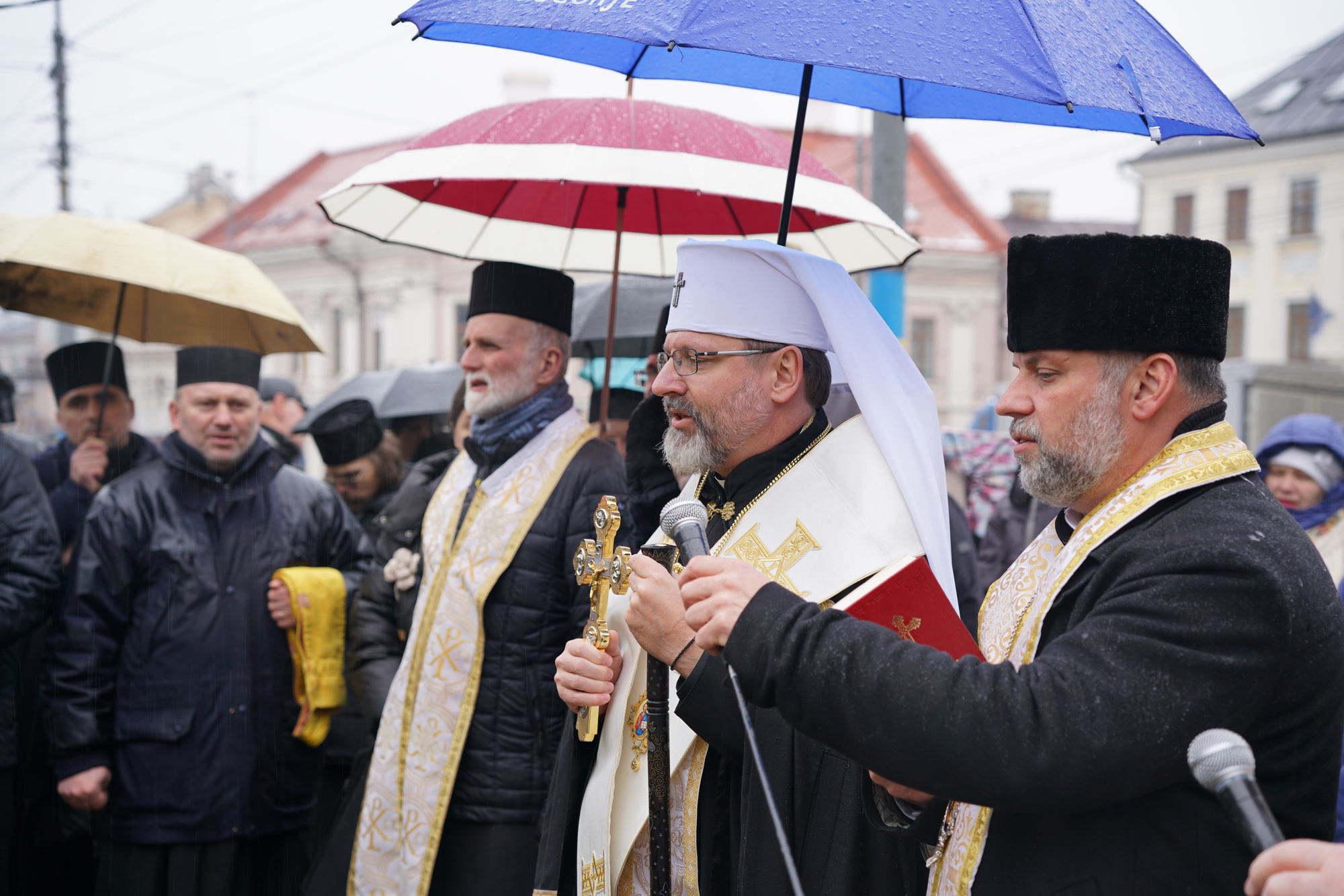«Місто Чернівці — великий культурний осередок життя нашої держави і Церкви. Мені випала честь у контексті діянь Постійного Синоду Єпископів нашої Церкви освятити цей вертеп. Попри дощ, у нас на серці світло. Різдво — це про справжній небесний мир, який іде до людини. Це таїнство присутності Всемогутнього у маленькій беззахисній дитині. Таїнство перемоги світла над темрявою, добра над злом. Приємно, що тут є єпископи з різних країн — владика Борис Ґудзяк з Філадельфії, очільник нашої Церкви у США, владика Володимир Ющак з Вроцлава, владика Богдан Дзюрах, єпископ у Німечччині та п’яти країнах Скандинавії. Свято єдності — бо 25 грудня усі християни України будуть відзначати Різдво разом з усім світом. Ми тут разом, аби відчути єднання. Бог з нами. Давайте будемо разом крокувати у молитві за наш багатостраждальний народ, за наше військо. Будемо готуватись прийняти Христа у наші серця та домівки», — промовив Блаженніший Святослав.