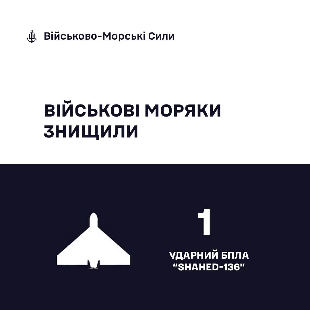 ⚡Сьогодні вночі, на Одещині, під час чергової атаки окупантів, силами і засобами Військово-Морських Сил ЗС України збито 1 ворожий дрон-камікадзе "SHAHED-136"
