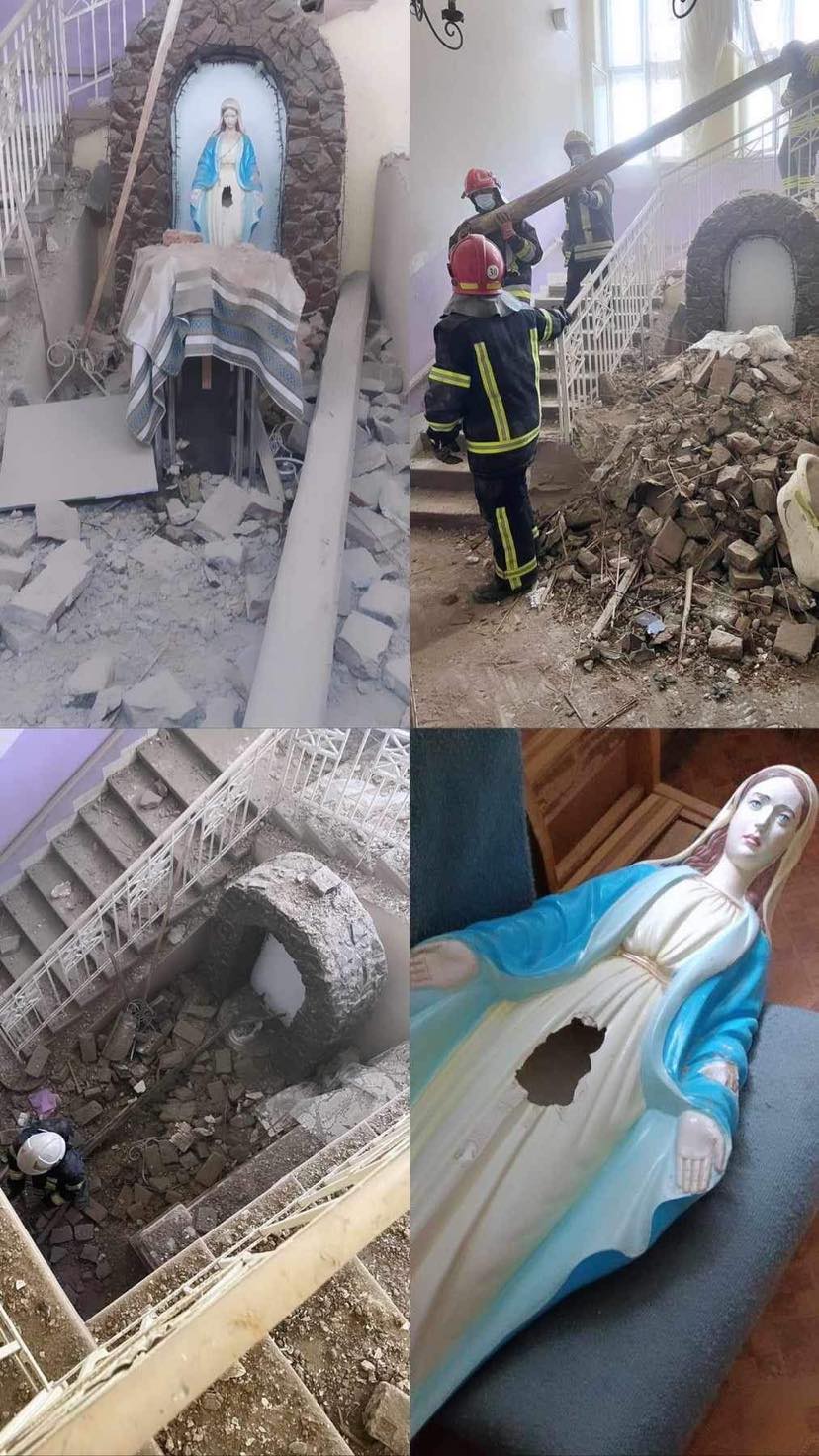 «Дякуємо Богородиці, що вберегла життя дітей»: Владика Володимир освятив фігуру Марії у дитячому будинку, пошкоджену внаслідок ракетного обстрілу Львова