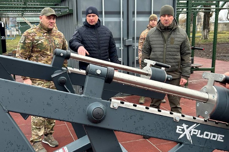 Надворі встановлена мобільна спортивна локація для тренувань. Її можна розгортати у різних місцях.