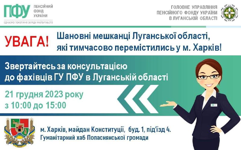 У четвер в Харкові луганчани зможуть звернутися до спеціаліста з пенсійних питань 20.12.2023, Середа | 16:22 Автор допису: Голова Луганської обласної військової адміністрації У четвер в Харкові луганчани зможуть звернутися до спеціаліста з пенсійних питань Прийом співробітником ГУ ПФУ в Луганській області відбудеться у хабі Попаснянської громади 21 грудня з 10:00 до 15:00. 📍Адреса: м. Харків, майдан Конституції, буд. 1, під’їзд 4. Джерело Друк / PDF