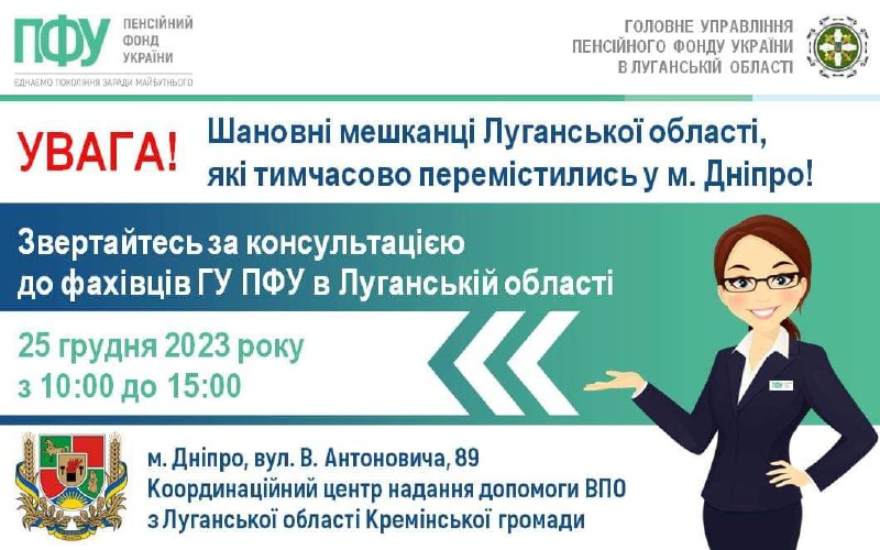 У понеділок в Дніпрі – прийом представників ПФУ Луганщини Консультація спеціаліста Головного управління… 24.12.2023, Неділя | 10:35 Автор допису: Голова Луганської обласної військової адміністрації У понеділок в Дніпрі – прийом представників ПФУ Луганщини Консультація спеціаліста Головного управління Пенсійного фонду України в Луганській області відбудеться у хабі Кремінської громади 25 грудня з 10:00 до 15:00. 📍Адреса: м. Дніпро, вул. В. Антоновича, буд. 89. Джерело Друк / PDF
