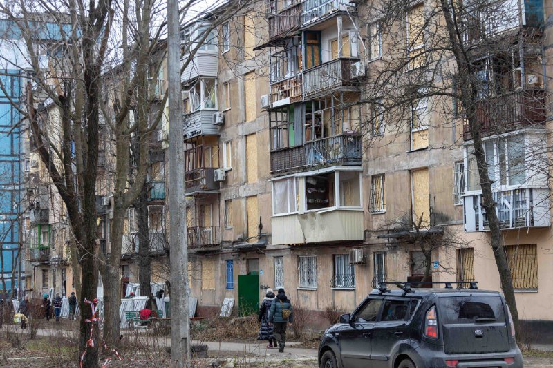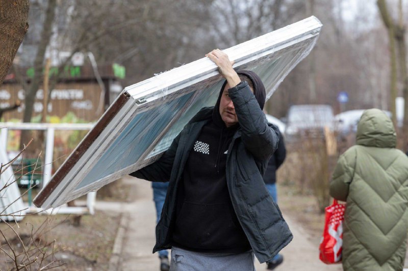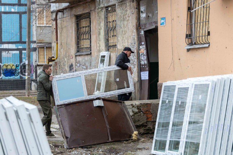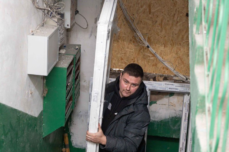 Дніпро. П'ятий день після ракетного удару. До понівечених багатоповерхівок привезли нові склопакети. Їх розносять по будинку, що через дорогу від потрощеного пологового.