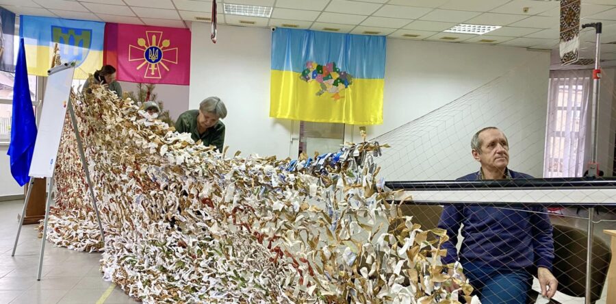 Вже більше тижня в Офісі люди об’єдналися та плетуть маскувальні сітки і власноруч виготовляють запалки для наших воїнів. Щоденно сюди сходяться як внутрішньо переміщені люди, так і місцеві серед яких і діти аби внести свою частинку справ задля великої  перемоги України.  Матеріали приносять небайдужі мешканці району.