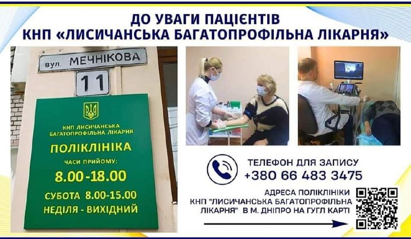 Поліклініка КНП «Лисичанська багатопрофільна лікарня» працює у м. Дніпро за адресою: вул. Мечнікова, 11 (правий берег, зупинка вул. Воскресенська).