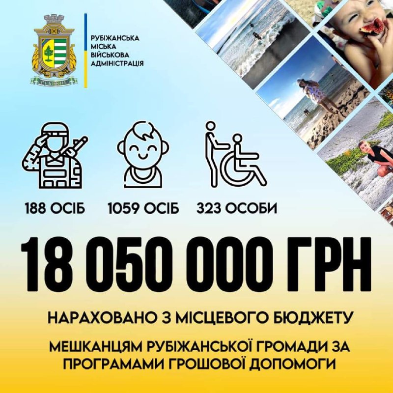 323 особи за Програмою надання грошової допомоги населенню Рубіжанської громади, які опинилися в складних життєвих обставинах/ є особами з інвалідністю унаслідок війни/ є членами сімей загиблих/померлих/безвісно зниклих Захисників і Захисниць України, одержали допомогу на 1 мільйон 820 тисяч гривень.