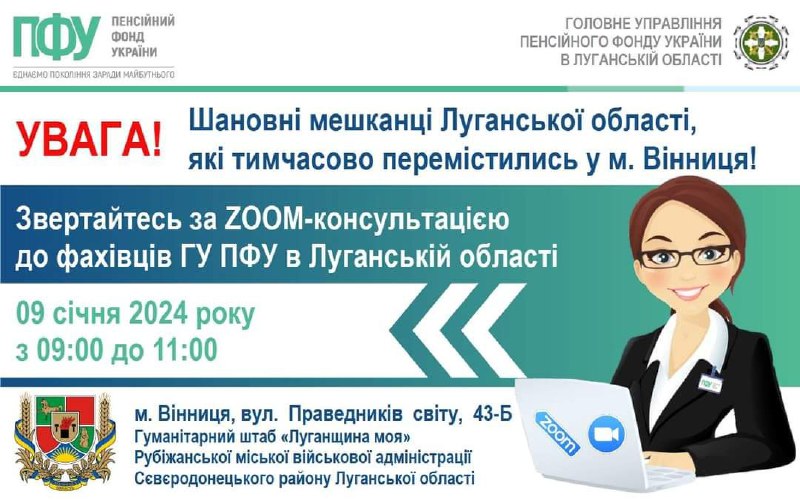 9 січня з 09:00 до 11:00 спеціаліст Головного управління Пенсійного фонду України в Луганській області у місцевому хабі надасть онлайн-консультації з питань субсидій, пільг, страхових та пенсійних виплат.
