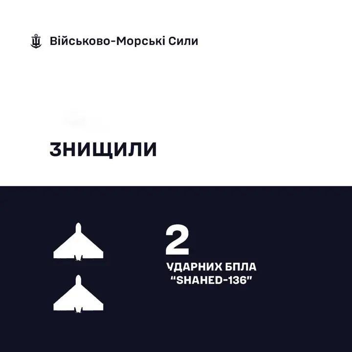 Підрозділами Військово-Морських Сил знищено 2 дрони-камікадзе “SHAHED-136” 8.01.2024, Понеділок | 8:23 Автор допису: Військово-Морські Сили Збройних Сил України Підрозділами Військово-Морських Сил знищено 2 дрони-камікадзе "SHAHED-136" На Одещині під час нічної атаки окупантів силами та засобами Військово-Морських Сил ЗС України було збито 2 дрони-камікадзе "SHAHED-136". Військово-Морські Сили разом з побратимами продовжують захищати Україну від підступного ворога! Разом до Перемоги! Слава Україні! Джерело Друк / PDF