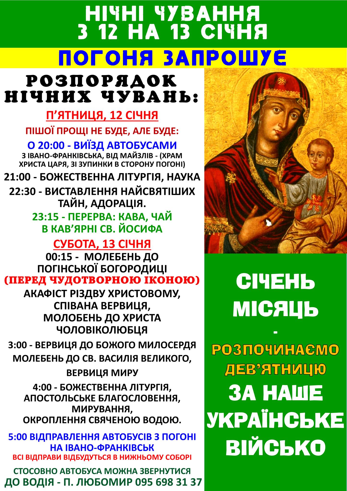 00:15 — молебень до Погінської Богородиці перед чудотворною іконою, акафіст Різдву Христовому, співана молитва на вервиці, молебень до Христа Чоловіколюбця;