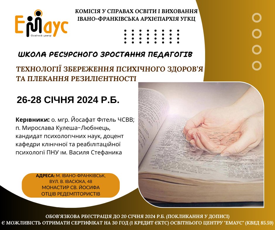 Комісія у справах освіти та виховання Івано-Франківської Архієпархії УГКЦ запрошує вчителів християнської етики та інших дисциплін до «Школи ресурсного зростання педагогів», що триватиме з 26 по 28 січня 2024 року. Тема зустрічей: «Технології збереження психічного здоров’я та плекання резильєнтності».