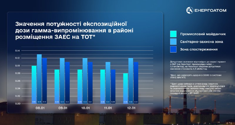 З 8-го по 12 січня 2024 року потужність експозиційної дози гамма-випромінювання в районі розміщення Запорізької АЕС на тимчасово окупованих територіях України відповідала чинним нормам.