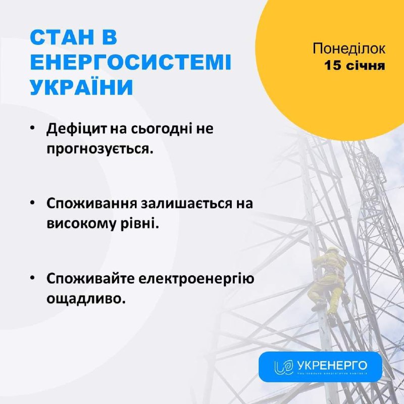СТАН ЕНЕРГОСИСТЕМИ 🔹 Дефіцит на сьогодні не прогнозується. 🔹 Споживання залишається на високому рівні. 15.01.2024, Понеділок | 11:18 Автор допису: Голова Луганської обласної військової адміністрації СТАН ЕНЕРГОСИСТЕМИ 🔹 Дефіцит на сьогодні не прогнозується. 🔹 Споживання залишається на високому рівні. 🔹 Споживайте електроенергію ощадливо. Джерело Друк / PDF