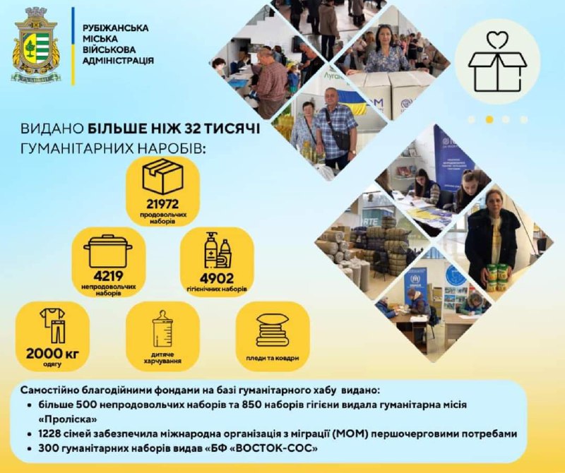 Благодійними організаціями проводились окремі заходи з видачі гумдопомоги. Так, більше 500 непродовольчих наборів та 850 наборів гігієни видала гуманітарна місія Проліска – Вінниця. 1 228 сім’ям першочергові потреби допомогла вирішити міжнародна організація з міграції. 300 гуманітарних наборів видано від «Схід SOS».