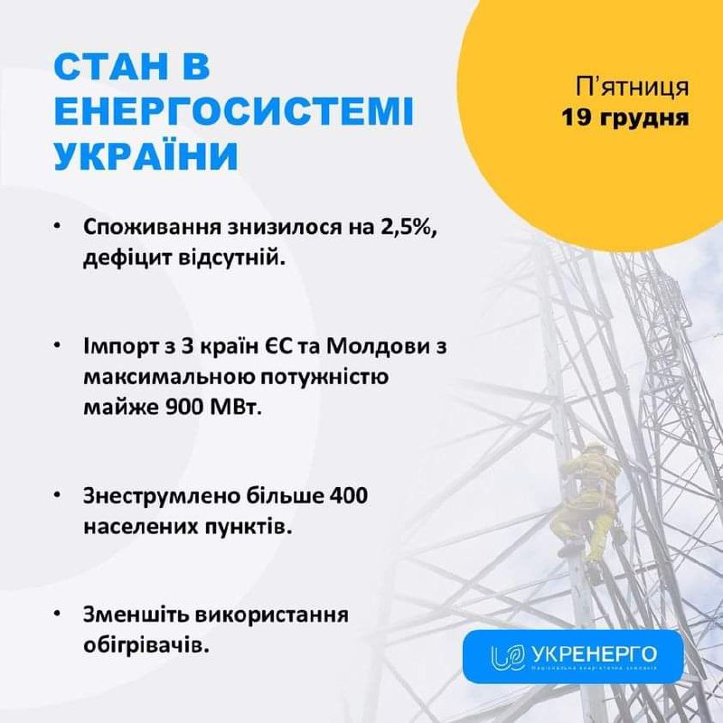 СТАН ЕНЕРГОСИСТЕМИ 🔹 Споживання знизилося на 2,5%, дефіцит відсутній. 🔹 Імпорт з 3 країн ЄС та Молдови з максимальною…