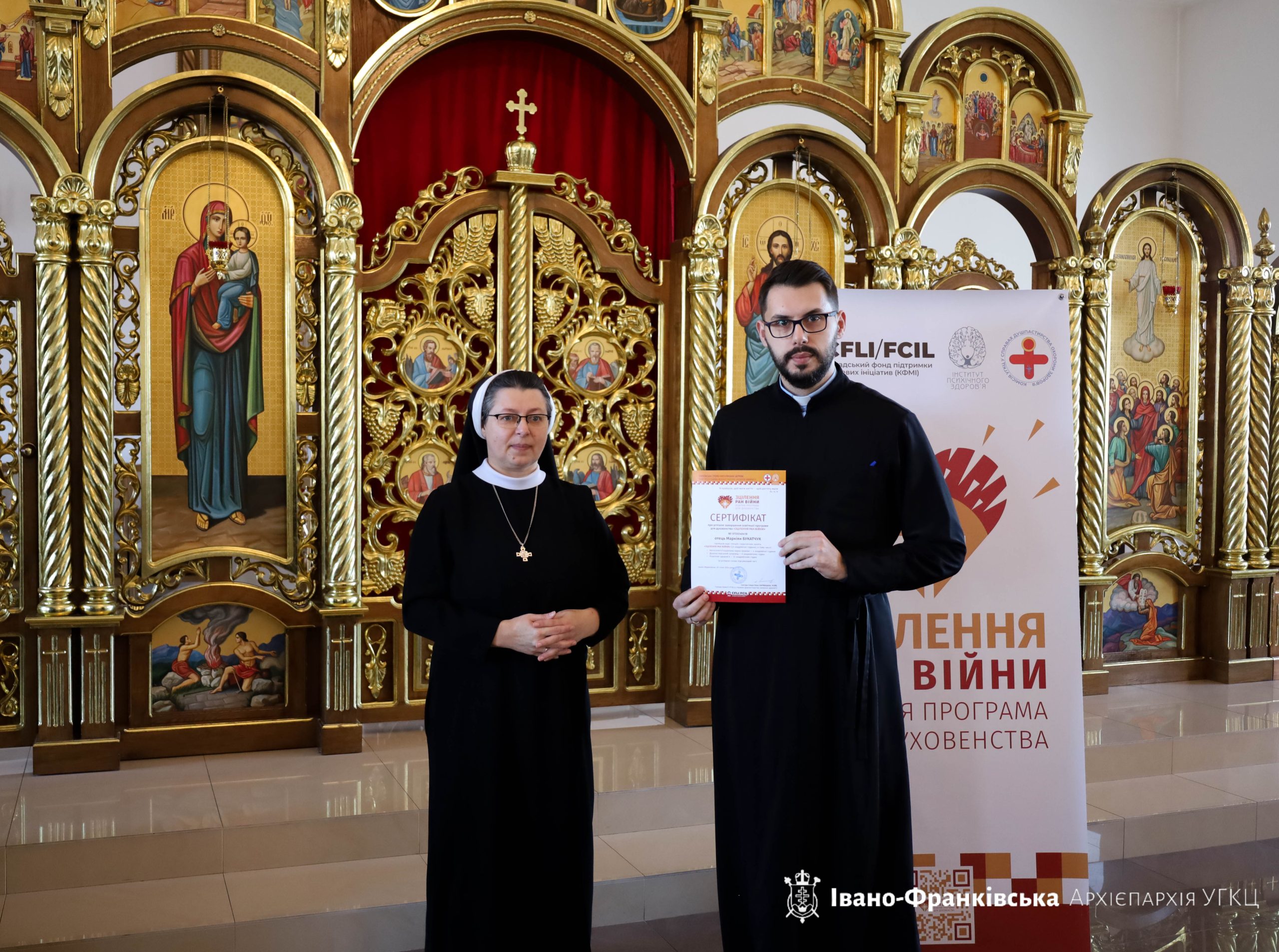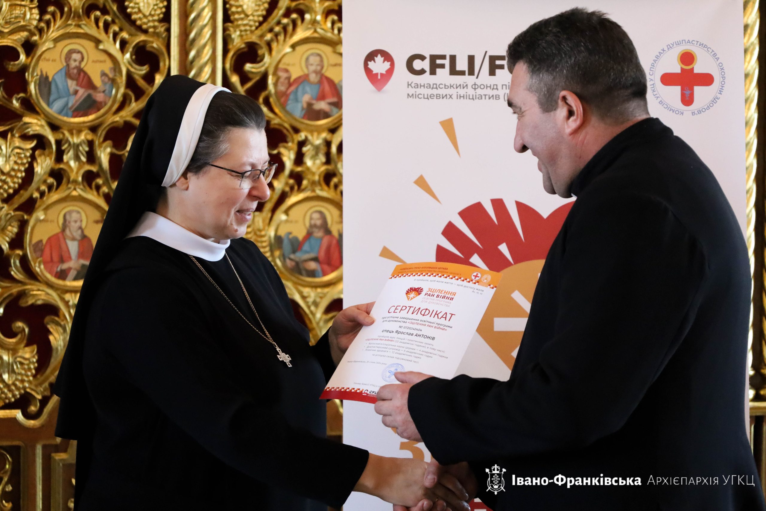 Згодом відбулася урочиста частина заходу – вручення сертифікатів про успішне завершення освітньої програми для духовенства «Зцілення ран війни». Сертифікати вручали Владика Микола Семенишин, с. Севастіяна Карвацька, ЧСВВ, о. Корнилій Яремак, ЧСВВ та о. Ярослав Рохман, голова Комісії у справах охорони здоров’я Івано-Франківської Архієпархії.