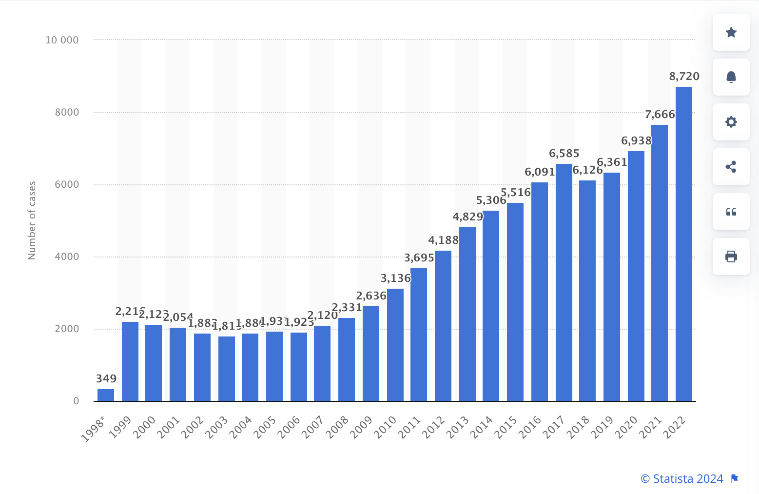Динаміка зростання кількості самогубств шляхом евтаназії в Нідерландах протягом 1998-2022 років