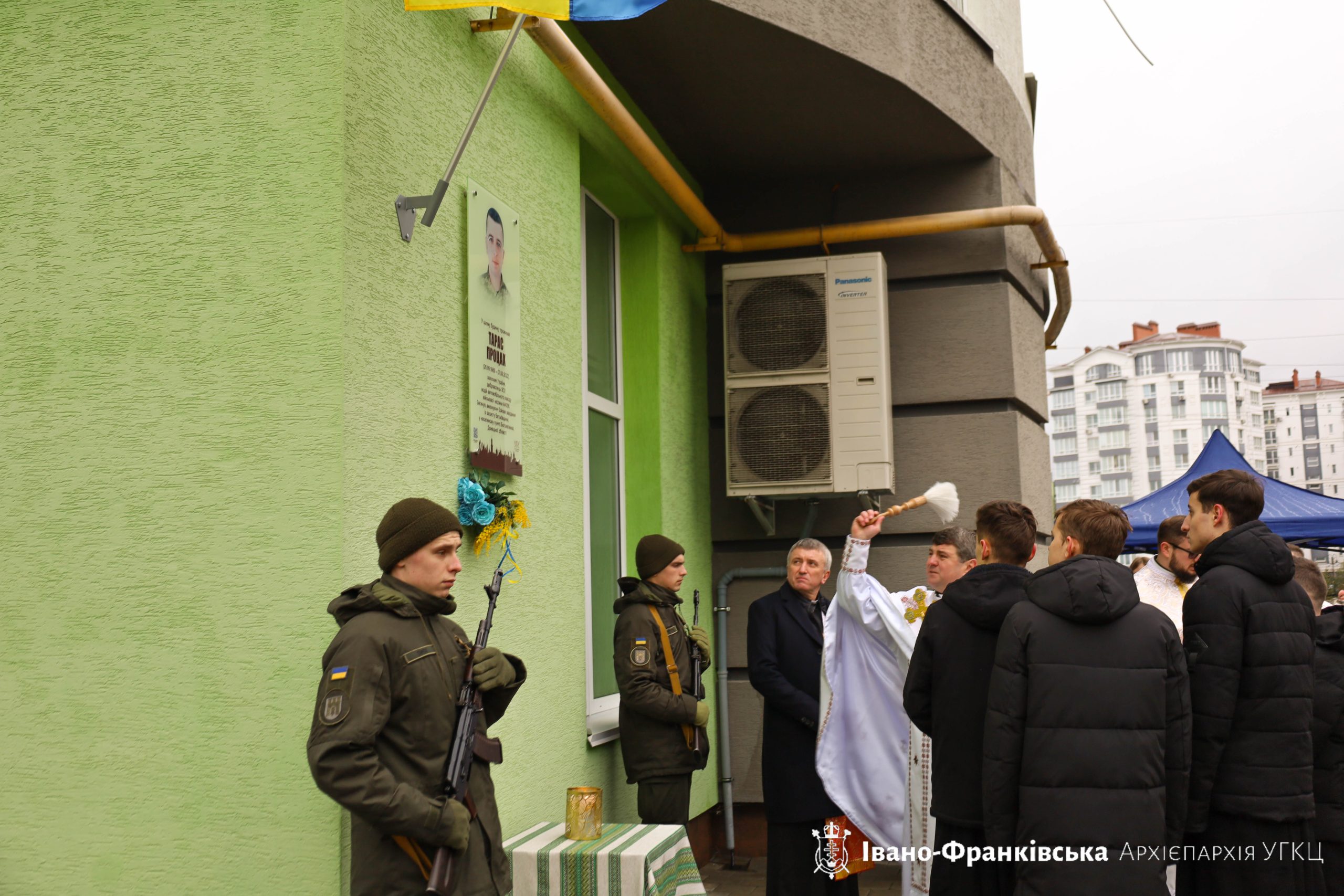 Розпочався захід вшанування пам’яті із виконання Державного гімну України. А відтак рідні полеглого Захисника, зокрема сестра — п. Людмила Андрухів, його племінники, а також міський голова Івано-Франківська п. Руслан Марцінків та староста Крихівецької громади п. Надія Фотуйма відкрили пам’ятну дошку Герою Тарасу на фасаді будинку, у якому проживав чоловік.