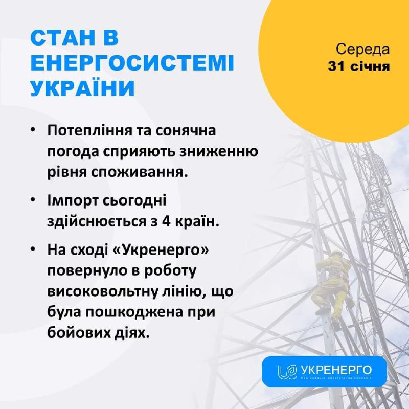 СТАН ЕНЕРГОСИСТЕМИ 🔹Потепління та сонячна погода сприяють зниженню рівня споживання. 31.01.2024, Середа | 13:14 Автор допису: Голова Луганської обласної військової адміністрації СТАН ЕНЕРГОСИСТЕМИ 🔹Потепління та сонячна погода сприяють зниженню рівня споживання. 🔹Імпорт сьогодні здійснюється з 4 країн. 🔹На сході «Укренерго» повернуло в роботу високовольтну лінію, що була пошкоджена при бойових діях. Джерело Друк / PDF