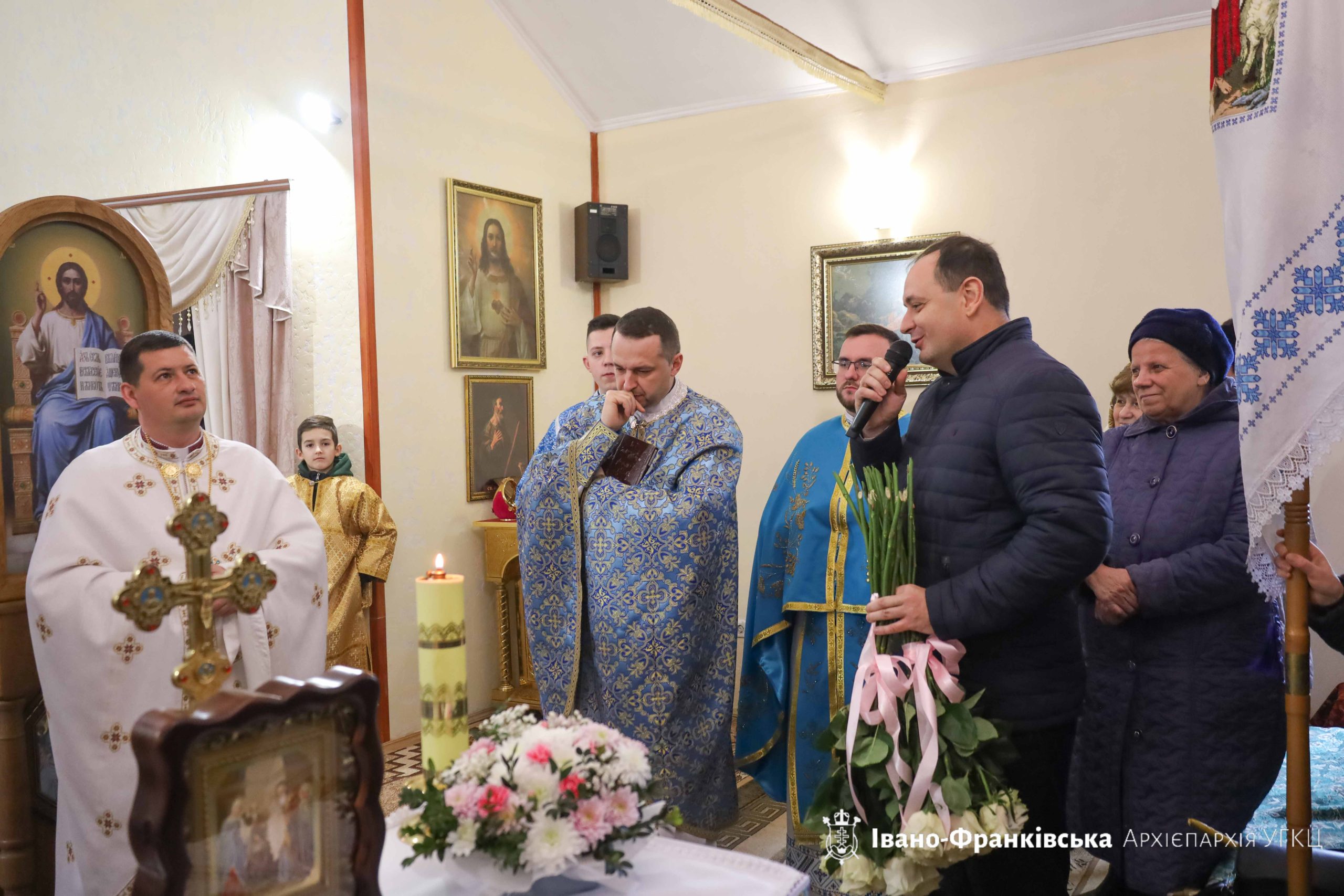 Далі о. Тарас привітав всіх присутніх із великим святом та подякував Владиці за постійну душпастирську опіку. Згодом Руслан Марцінків привітав вірних із празником та подякував парафіяльній спільноті за соціальне служіння на благо українського народу.