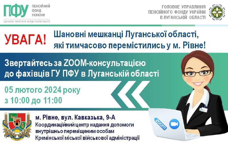 На запитання ВПО 5 лютого в Рівному відповідатимуть фахівці ПФУ нашого регіону 3.02.2024, Субота | 14:39 Автор допису: Голова Луганської обласної військової адміністрації На запитання ВПО 5 лютого в Рівному відповідатимуть фахівці ПФУ нашого регіону У понеділок з 10:00 до 11:00 у місцевому хабі Кремінської громади відбудеться онлайн-консультування з питань пенсійного забезпечення, субсидій і пільг. 📍Адреса: м. Рівне, вул. Кавказька, 9-А. Джерело Друк / PDF