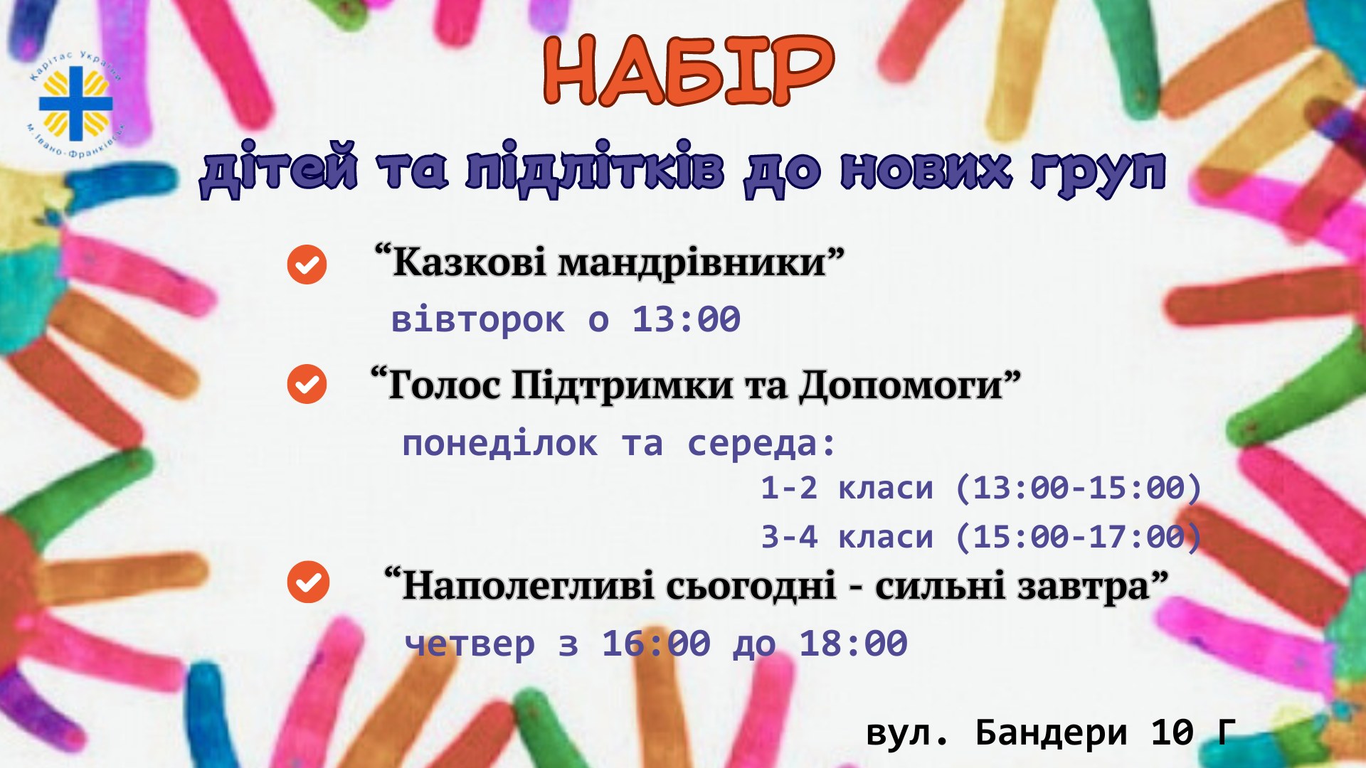 Карітас Івано-Франківської Архієпархії УГКЦ оголошує набір дітей та підлітків до 3-ох нових груп на безкоштовні заняття «Простору дружнього до дитини».