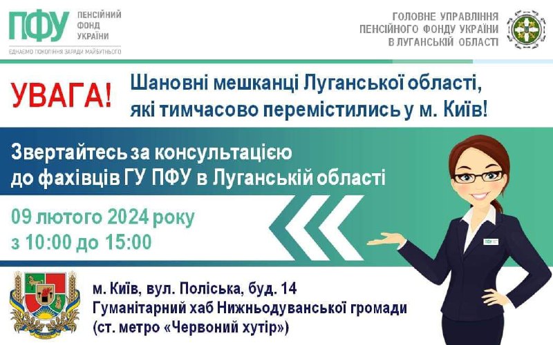 9 лютого відбудеться прийом спеціалістом ГУ ПФУ в Луганській області наших ВПО, які тимчасово мешкають у Києві.