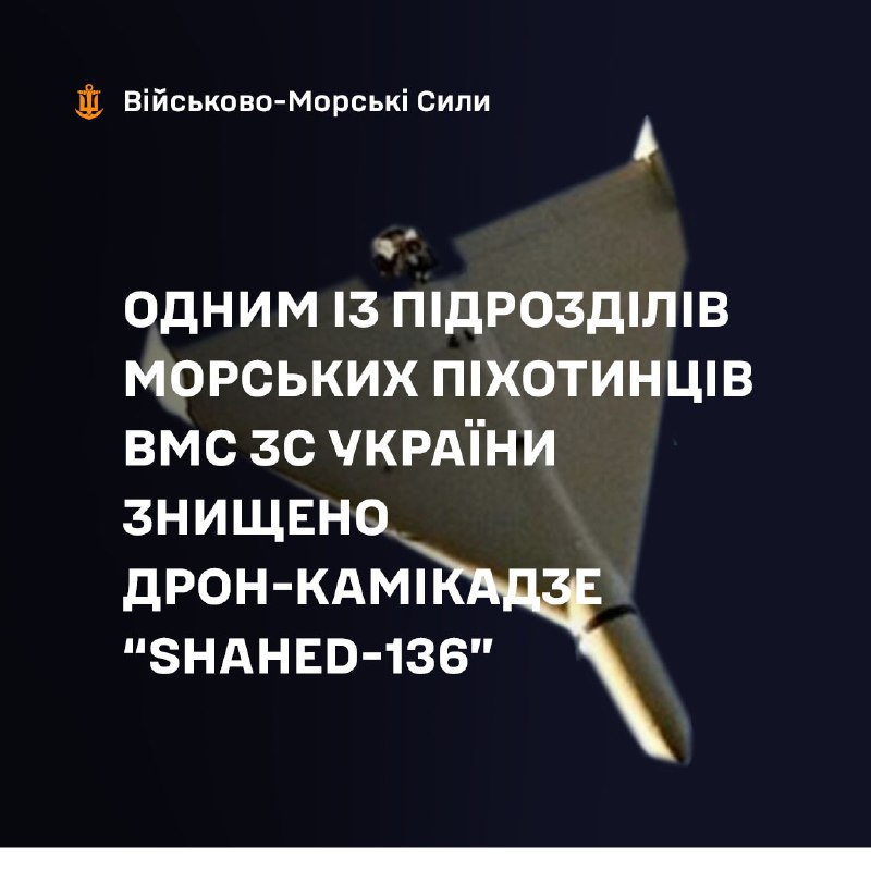 Сьогодні вночі, на Херсонському напрямку , під час повітряної атаки окупантів, силами та засобами мобільної вогневої групи однієї з бригад морської піхоти Військово-Морських Сил ЗС України було збито ворожий дрон-камікадзе "SHAHED-136".