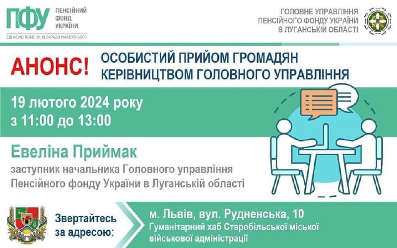 Керівництво ПФУ Луганщини прийматиме в понеділок у Львові 19 лютого відбудеться особистий прийом заступника… 18.02.2024, Неділя | 14:27 Автор допису: Голова Луганської обласної військової адміністрації Керівництво ПФУ Луганщини прийматиме в понеділок у Львові 19 лютого відбудеться особистий прийом заступника начальника Головного управління Пенсійного фонду України в Луганській області Евеліни Приймак. Звертайтеся з 11:00 до 13:00 до хабу Старобільської міської військової адміністрації. 📍Адреса: м. Львів, вул. Рудненська, 10. Джерело Друк / PDF